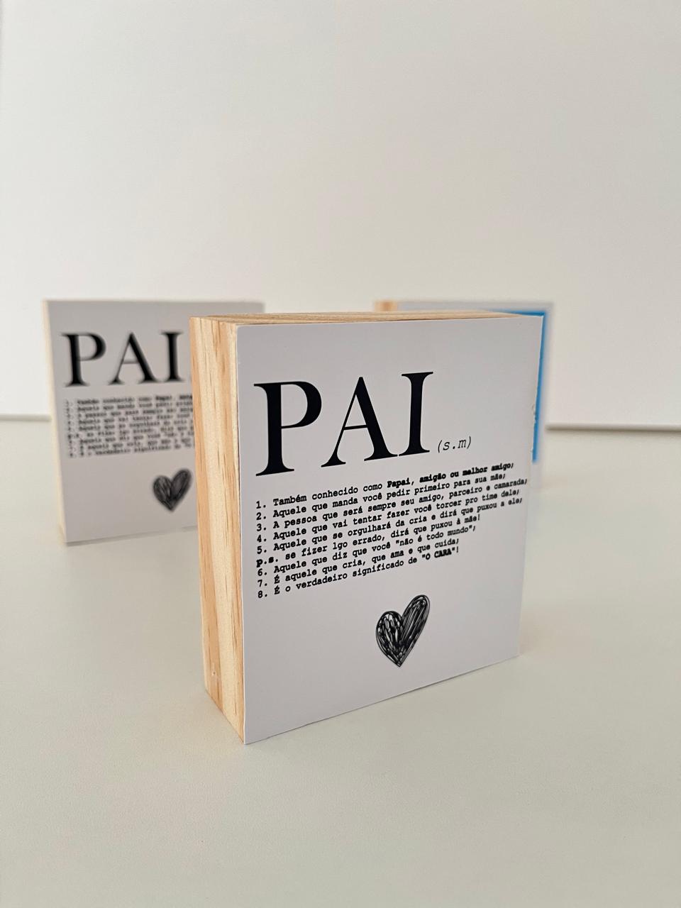 Uma homenagem simples, mas cheia de significado. Este bloquinho de madeira é personalizado com a palavra PAI em destaque, acompanhada de palavras que expressam tudo o que ele representa: